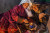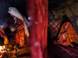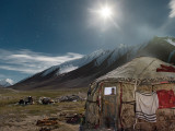 一个夏天的傍晚,一对年轻夫妇在前去进行交易的路程中,在帐篷外用毯子遮盖住牦牛。帐篷由杆子和毛毡所搭成,这样便携的"家"是很多游牧人都使用的。帐篷的木门是用低海拔地方的树木所制成的。