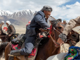 一位柯尔克孜族男人在进行传统民间运动"马背叼羊"时骑着马、把鞭子咬在嘴里的瞬间。"马背叼羊"是与马球类似的一种竞赛,只是把球换成了山羊。
