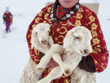 一位女孩抱着两只小羊羔准备回母羊身边。在冬季极度寒冷的日子里,牧民会把牲畜幼崽放进自己的小屋中,以免它们冻死。