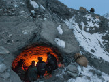 柯尔克孜族的女孩们在结冰的泉水上凿开一个洞后,把塑料水壶装满水,并把水壶运回家去。由于男人们忙于放牧和商品交易,所以家务重担就落在了女人肩上。