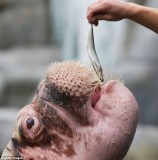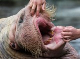 海象幼崽"奥丁"在德国一家动物园接受牙齿检查前吃了不少鱼,但检查开始时它的脾气就不再那么温顺,而是变得暴躁不安。