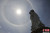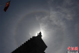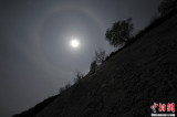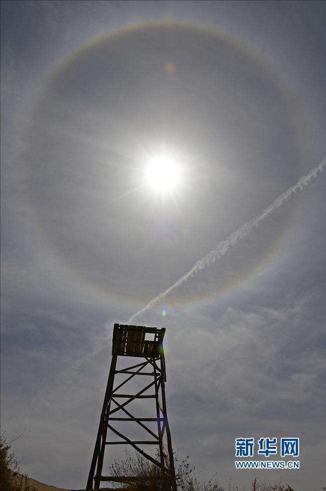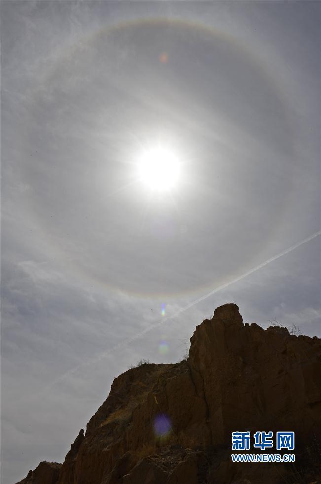 4月29日,银川市上空出现日晕景观,彩色的光环环绕太阳,绚丽多彩,吸引众多市民驻足观看。据悉,日晕是一种大气光学现象,是日光通过卷层云时,受到冰晶的折射或反射而形成的。