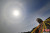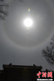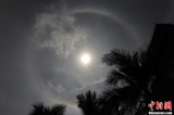 4月29日,海南三亚上空出现日晕奇观,一个灿烂的光圈将太阳包围,像给太阳戴了个花环。