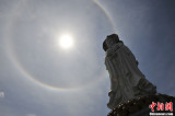 4月29日,海南三亚上空出现罕见的日晕奇观,三亚南山景区108米海上观音像被巨大的日晕光环包围。