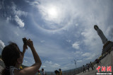 4月29日,海南三亚上空出现罕见的日晕奇观,在三亚南山景区108米海上观音像前,不少游客驻足观看这一奇景。