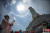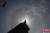 4月29日,海南三亚上空出现罕见的日晕奇观,在三亚南山景区108米海上观音像前,游客在日晕下拜佛。