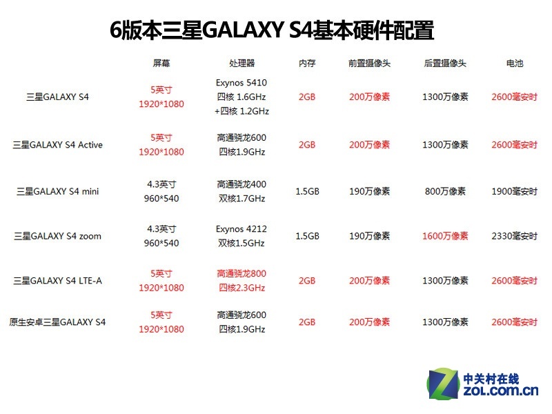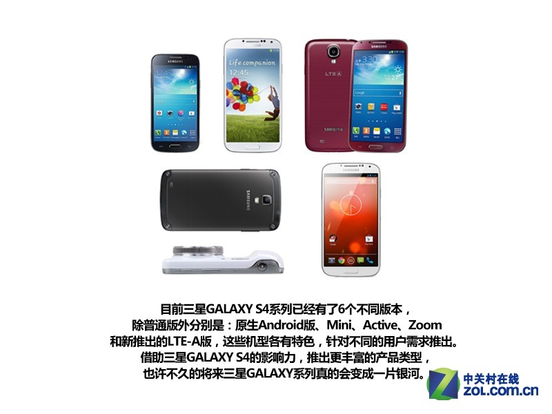 目前三星GALAXY S4系列已经有了6个不同版本,除普通版外分别是:原生Android版、Mini、Active、Zoom和新推出的LTE-A版,这些机型各有特色,针对不同的用户需求推出。