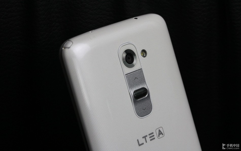 LG G2的背部设计颇具特点,我们可以看到摄像头下方为三枚实体按键,分别为电源键和音量调节键。这个设计非常巧妙,提升了用户在单手操作时便利性。