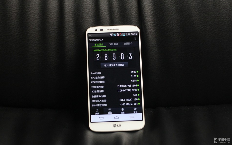 通过安兔兔评测软件进行跑分测试,LG G2的成绩为28983分,虽然没有上30000+,但是这样的成绩也达到了顶级水准,在大型游戏和多任务处理时,也能轻松应对。
